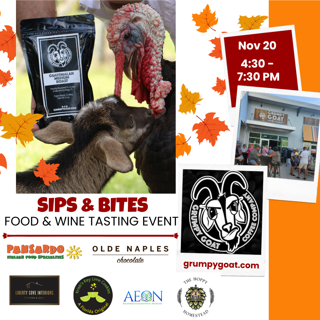 AEON Regenerative and Aesthetic Medicine will serve as the wine sponsor for Grumpy Goat Coffee’s Thanksgiving Sips & Bites free tasting event Thursday, November 20 from 4:30 to 7:30 p.m. The Grumpy Goat Coffee roastery is located at 28280 Old 41 Rd., Unit 11, Bonita Springs. The tasting event is open to the public. Attendees can meet their local master coffee roaster and other local artisan food and beverage experts and enjoy samples of their creations in a casual, happy hour style setting.
