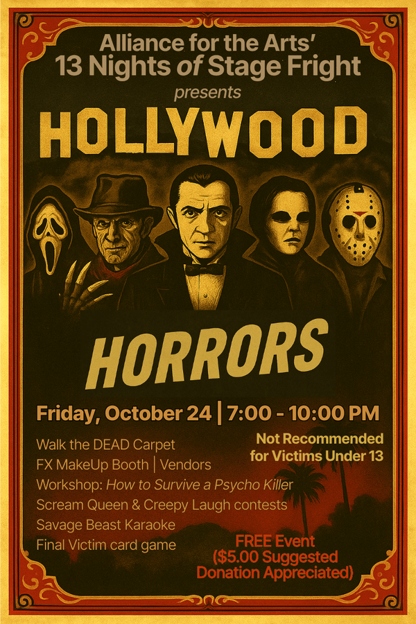 The red carpet’s stained in blood and the stars of the silver scream are out to play… Hollywood Horrors invites you to a night where fame fades and fear takes center stage.