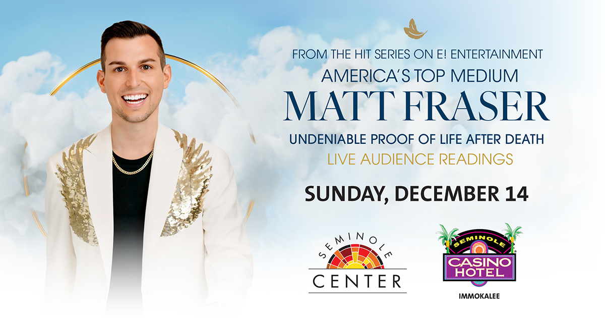 Add to Calendar 2025-12-14 20:00:00 2025-12-14 21:30:00 Matt Fraser IMMOKALEE, Fla. – Matt Fraser, America’s Top Psychic Medium and star of the hit television series on E! Entertainment, will appear at Seminole Casino Hotel Immokalee Sunday, Dec. 14 with doors opening at 7 p.m. and the show beginning at 8 p.m. Tickets will be available Friday, July 18 from Ticketmaster or at www.moreinparadise.com. Fans can access the venue presale Thursday, July 17 at 10 a.m. through Seminole Casino Hotel’s Facebook, and Instagram. Attendees must be 21. Parking is free. Location Visit Fort Myers vcb@leegov.com America/New_York public